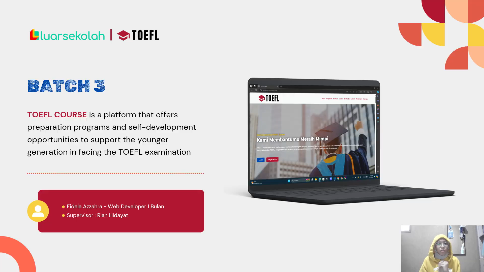 Hi everyone. I am pleased to announce that I have successfully completed an independent internship conducted remotely with Luarsekolah from March 4th to April 5th, 2024 Magang+ program offers an opportunity for anyone to experience working and completing projects relevant to real industry cases. Web Developer is one of the paths within the information technology occupation. Within this occupation, there are two paths: UI/UX Designer and Web Developer, with durations ranging from one to three months. I chose the Web Developer path with a one-month duration, which was conducted remotely. Throughout the week, Web Developer participants are required to attend two online meetings with their respective supervisors. The first meeting, usually held on Mondays, consists of presentations and explanations of weekly tasks for the duration of one month. The second meeting, held on Fridays or Saturdays, is dedicated to joint evaluations. During each evaluation session, every intern is required to present the progress of their projects, including the website interface and explanations of the code. Each week, the learning materials provided by the supervisor. In the first week, the material focused on the basic use of HTML. In the second week, CSS was introduced to the web page created in the first week. The third week included an introduction to basic logic using JavaScript. In the fourth week, each participant was equipped to prepare for the final project. The final project consists of two assignments. For the first assignment, participants are required to complete the website program they have developed. For the second assignment, participants are required to create a video detailing their activities during the internship with Luarsekolah, as well as an overview of the project they have created. At the end of the internship period, participants will undergo a graduation session, scheduled for April 5th, on Friday. Participating in Internship Batch 3 with Luarsekolah has been a valuable experience for me. Not only has it taught me discipline and responsibility, but it has also trained me to think logically and solve problems systematically. I would like to express my gratitude to Mr. Rian Hidayat, my supervisor, for providing me with valuable feedback and guidance throughout this internship. I will take the feedback provided and use it as a lesson to become a better individual in the future.