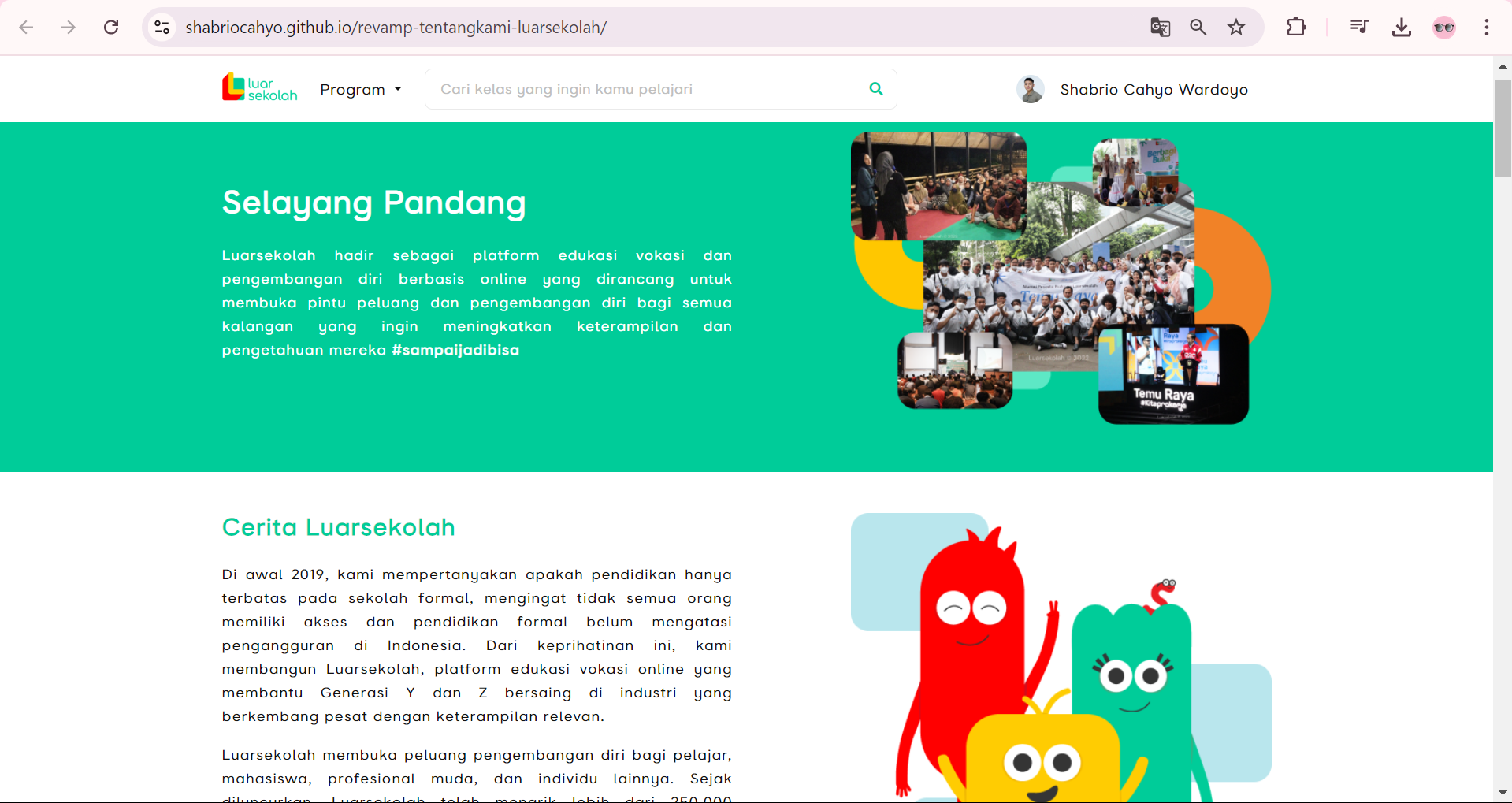 Dulu awalnya aku sempet takut mau ikut magang program PBI. Karena takut kaya gak bisa atau kurang skill yang di miliki. Ternyata program PBI ini beneran diajarin dari basic. Gak cuman itu, ternyata asik banget selama program magang berlangsung. Dari tim Luarsekolah sampai supervisinya baik dan asik semua. Ketemu temen magang asik dan juga bisa seru-seruan saat diskusi. Mengikuti program PBI ini juga membawa ilmu baru yang lebih dalam lagi buat aku, aku banyak belajar dari program ini. Terima kasih Magang Luarsekolah.